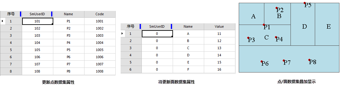 - 面A、B、C、D、F属性被点 P1、P2、P4、P5、P8 更新,SmUserID 和 Name 值均更新为对应点对象的属性值。