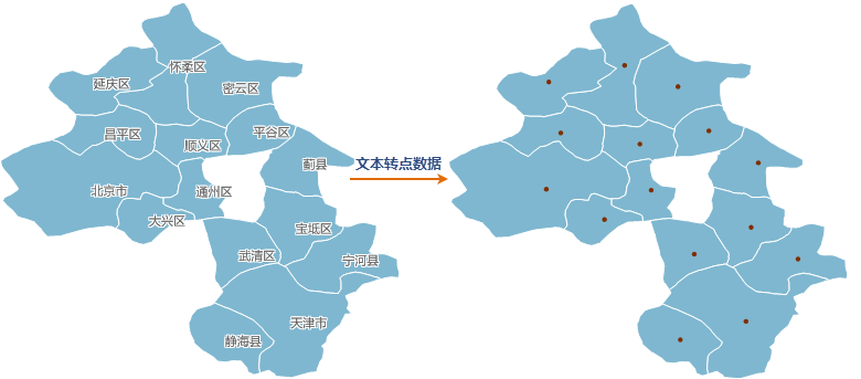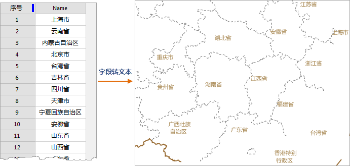 - 把数据集中的某个字段内容,转变到文本数据集,通过此功能可以实现地图标注。例如我们可以将 China 数据源下 Province_R 数据集的 Name 字段转换为文本数据,将此文本数据和 Province_R 数据集在同一窗口中显示,以实现对 Province_R 数据集的标注。