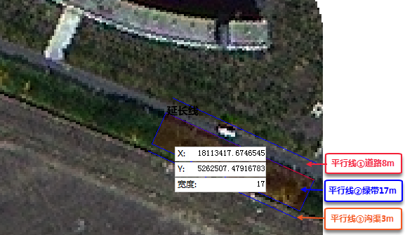 - 在地图窗口中会实时标识鼠标位置的点坐标 X、Y 坐标和宽度值(可以通过按 Tab 键,在三个参数输入框间切换)按 Enter 键,完成平行线下一个节点的坐标值。