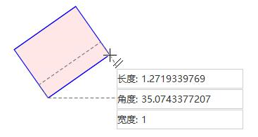 - 确定起点和宽度后,地图窗口中会实时标识鼠标位置与起点连线的长度及其与 X 轴正方向之间的夹角和宽度值。在参数输入框中输入长度和角度值(可以通过按 Tab 键,在两个参数输入框间切换),按 Enter 键确认后即可确定平行线的长度。
