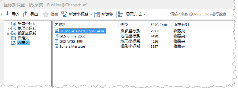 只有当用户选中工作空间管理器中的一个或多个数据源结点或者选中同一数据源下的一个或多个数据集结点时,“投影设置”下拉按钮才为可用状态。单击该下拉按钮,下拉菜单中包含“常用投影”和“投影设置”两项,常用投影显示收藏夹内的投影文件。(有关收藏夹功能的相关操作,请参见投影设置-收藏。)若收藏夹内无任何投影文件,“常用投影”项无内容显示;单击“投影设置”项,打开“投影设置”窗口,用户可在该窗口中设置当前选中数据源或数据集的投影信息。