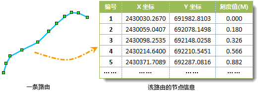 存放线类型数据的一种数据类型,线对象的每个节点除了有地理坐标值,还有一个刻度值(M 值),代表该节点到起点的距离。可以通过线及线上的点数据联合生成路由数据集。