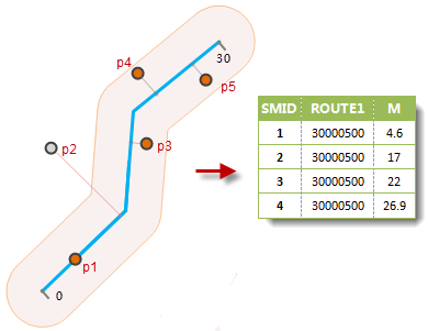 由点数据和路由数据生成点事件表。按照指定的查找半径,对路由对象生成一个缓冲区域,这个区域称为查找范围。落在该区域内的点用于生成事件表,每个点对应一个事件。查找范围外的点不会生成事件。生成后的点数据,会增加两个属性字段,分别保存路由 ID 和 M 值。
