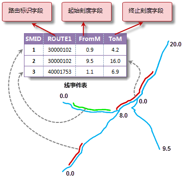 线事件发生在路由的一段上。如某段道路的铺设材质、交通拥堵情况、管线的管径大小、发生坍塌的路段等。如下图所示,在线事件表中,每个线事件必须包含一个路由ID (路由标识字段),并使用起始刻度字段和终止刻度字段来存储描述事件的位置。