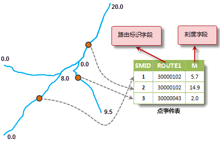 点事件发生在路由上的一个精确点位置上。例如,发生在公路上的交通事故、高速公路上的测速仪器、公交站点、管线上的阀门等。在点事件表中,每个点事件都对应一个路由 ID(路由标识字段),并使用一个字段来存储描述点事件的位置,即刻度字段。