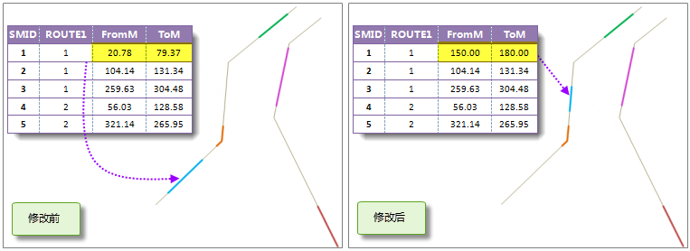 - 修改空间数据的路由 ID,则事件表中对应记录的路由 ID 值也会改变;同时,空间数据的几何信息也会根据修改情况发生相应的变化。