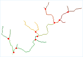 连接后的水系网络记录了水系节点的连接信息,体现了水系的网路结构。连接成功后,每条河段都有唯一的栅格值。如下图所示,图中红色的点为交汇点,即河段与河段相交的位置。河段是河流的一部分,它连接了两个相邻交汇点,或者一个交汇点和汇水点,或连接一个交汇点和分水岭。