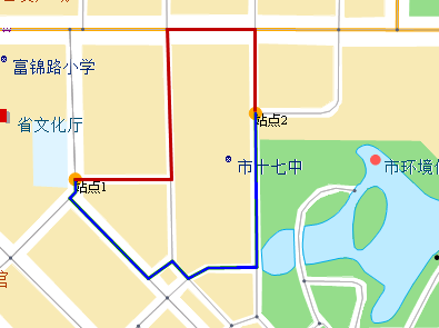 分析时是否按照弧段数最少查询路径。由于弧段数少不代表弧段长度短,所以在进行路径分析时可能查询的结果不是最短路径。如下图所示,连接站点1和站点2的路径有两条,其中红色路径(4段)弧段数少于蓝色路径(8段)。当选中“弧段数最少”复选框,红色路径是查询得到的结果;否则得到的是蓝色路径。