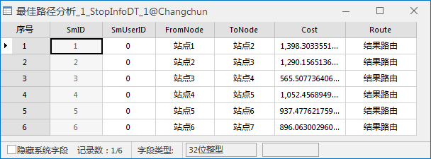 如下图所示,为一个站点统计信息属性表。表中记录了分析结果经过每个站点的顺序以及所用的耗费。字段 FromNode、ToNdoe 表示起始站点和终止站点, Cost 字段表示相邻站点之间的耗费,Route 字段表示分析生成的路由名称。