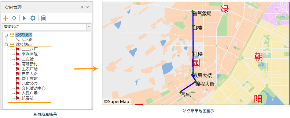 - 执行完成后,分析得到的站点名称会自动显示到当前地图展示;在实例管理窗口中生成途径站点结果依次排列在途径站点的信息目录树中,单击某一具体站点,地图中将自动定位至该站点并高亮显示。