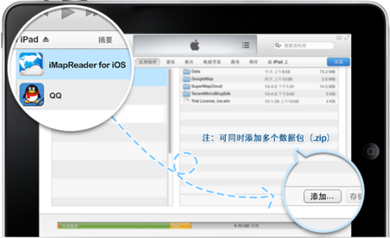 图:在线商店的地图列表 - 离线传输:通过 iDesktop 7C 或者 iMapEditor 7C “发布地图”的“仅打包”功能制作的数据包,可在 iMapReader 中直接打开查看。在关闭 iMapReader 的情况下,将iPad与电脑连接,打开 iTunes 并找到自己的设备,点击菜单中的应用程序,找到“共享文件”,选中 iMapReader,并将数据(.zip)包添加至 iMapReader 文档中即可。