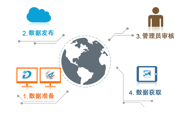 发布地图可分两种方式实现:一种是将数据直接打包发布,一步实现地图发布;一种是先将数据打包,再通过发布“本地已有数据包”方式,分两步实现地图发布。发布地图可大致分为数据准备、数据发布(包括数据打包和上传)、管理员审核、数据获取几个步骤,如下图所示: