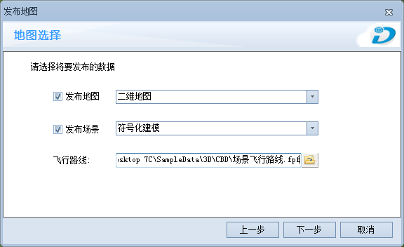 - 在选择数据对话框中勾选“使用中的工作空间”方式,单击下一步,分别选择“二维地图”和“符号化建模”为要发布的地图和场景,单击“飞行路线”右侧的