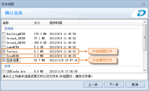 按钮,添加第二步做好的“场景飞行路线.fpf”。 - 在“确认选择”对话框中,勾选“总体场景”缓存文件和“Texture”贴图做为外挂文件。