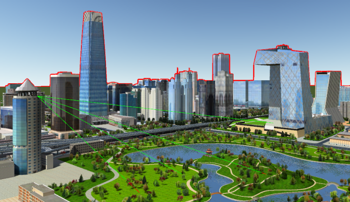 天际线分析功能可根据观察点,生成当前场景窗口中建筑物或其他要素顶端边缘与天空的分离线。