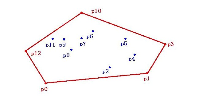 凸包(Convex Hull)是计算机图形学中的概念,在二维平面中,凸包是一个最小凸多边形,它能满足点集中的任何点或在多边形边上,或在多边形内,如下图所示,红色线所表示的多边形为一个平面凸包,它能够包含点集P。
