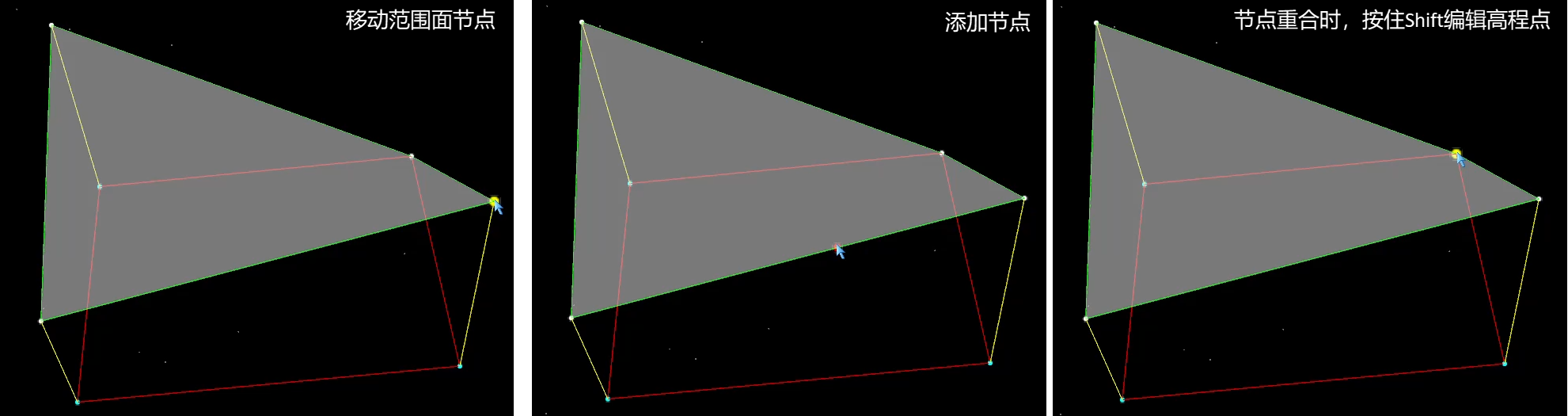 当三维面对象的高程面与范围面重合时,选中节点后,按住Shift键并同时移动鼠标可编辑面对象高程节点。