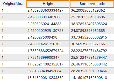 转换成功后,打开二维面数据集的属性表,平台为其自动生成了BottomAttitude与Height两个属性字段,其中BottomAttitude记录了该二维面对应转换前模型对象的底部高程,Height记录了转换前模型对象的高度。如下所示: