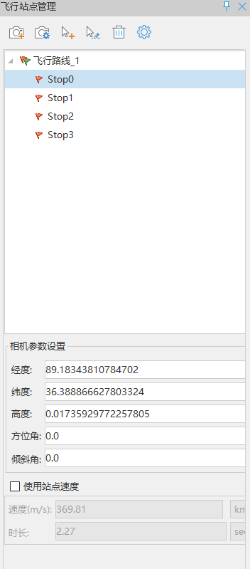 在“飞行站点管理”窗口中,选中飞行路径节点中的站点节点,在该窗口下部将显示选中站点的具体观测位置和角度的相关参数,同时也可修改这些参数改变站点的观测状态。若用户同时选中多个站点节点,则显示的参数为编号最靠前的站点的参数。