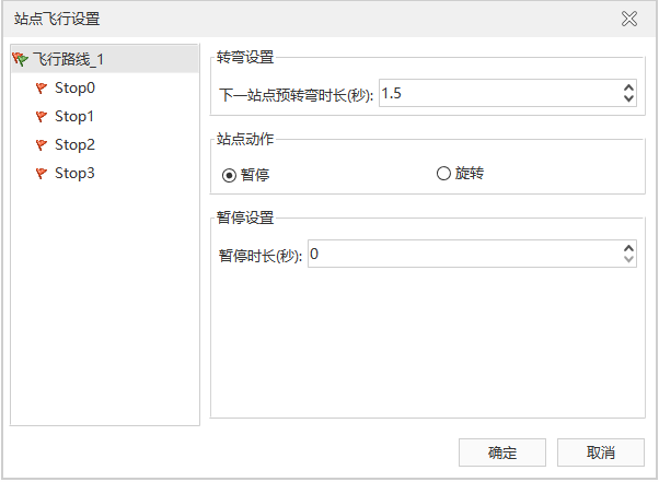 - 站点飞行设置:选择右键菜单中的“站点飞行设置”,弹出“站点飞行设置”对话框,可设置站点的暂停或旋转飞行,具体操作见上。