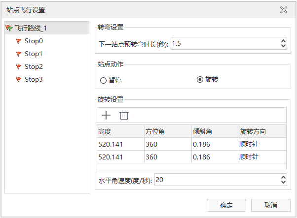 - 当选择“旋转”模式时,对话框下方显示“旋转设置”相关参数。在“旋转设置”信息列表中列出了绕站点飞行信息,包括观测站的高度、方位角、倾斜角,以及从观测站点的当前方向旋转到下一方向的旋转方向。应用程序会按列表中先后顺序,按指定的旋转方向等信息旋转到下一条绕站点飞行信息,直到结束(观测站点的最后一个旋转方向无效)。双击单元格区域,区域会变为可编辑状态,可输入指定的信息;单击“旋转方向”下拉按钮,可选择逆时针或顺时针;列表上的“添加”,“删除”按钮用来新增/删除每一条观测站点信息;列表下的“水平角速度”编辑框用来设置旋转时的水平角角速度,以度/秒为单位。