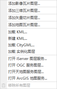 - 打开iServer图层服务/打开OGC服务图层/打开天地图服务图层/打开ArcGIS地图服务:向场景添加多种在线地图服务。