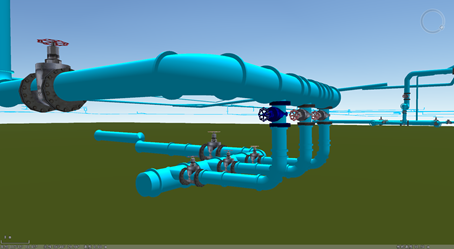 - 设置后阀门模型将根据管线走向自适应调整角度,即:阀门的底部管道沿管线方向,而阀门的开关则垂直于管线方向,实现效果如下图所示: