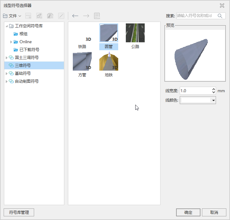 - 在“线型符号选择器”中选择“三维线型”,点击所要设置符号,可根据情况更改符号的“线宽度”和“线颜色”;