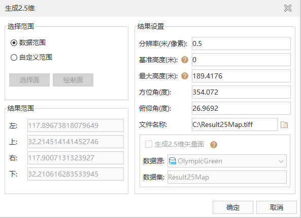 - 在对话框的“结果设置”处,可设置结果数据的分辨率、基准高度、最大高度、方位角、俯仰角、文件名称和是否勾选生成2.5维矢量面。