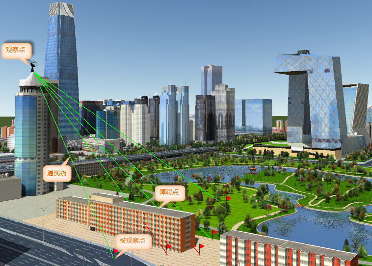通视分析是三维GIS中常用的分析功能,用于判断三维场景中任意两点之间的通视情况。可根据在 3D 空间中相对于某表面或多面体要素类提供的障碍的位置,计算观察点与被观察点之间的通视性,沿着这些点之间的视线确定可见性。
