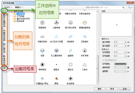 - 在符号选择其中,只有工作空间的符号库可以在符号选择器中进行进一步编辑,所加载的符号库中的符号只能进行符号浏览和应用,其中的符号不能进行编辑操作。