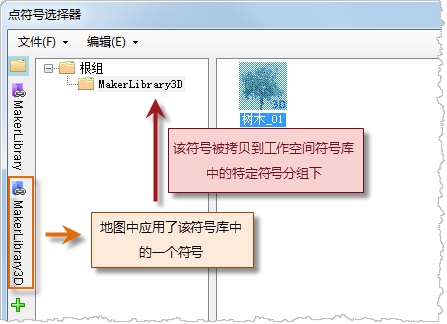 - 符号对地图进行符号化时,选择了加载的更多符号库中的符号,而非工作空间中的符号,则该符号会自动复制到工作空间的符号库中,表现为在工作空间中的符号库的根组下建立一个名称与加载的符号库显示名称相同的符号分组,然后将使用的符号拷贝到该符号分组下。