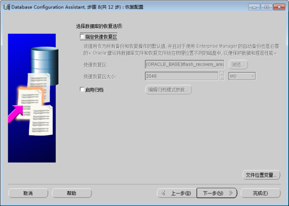 在此步骤中指定快速恢复区并启用归档,以便系统发生故障时恢复您的数据。