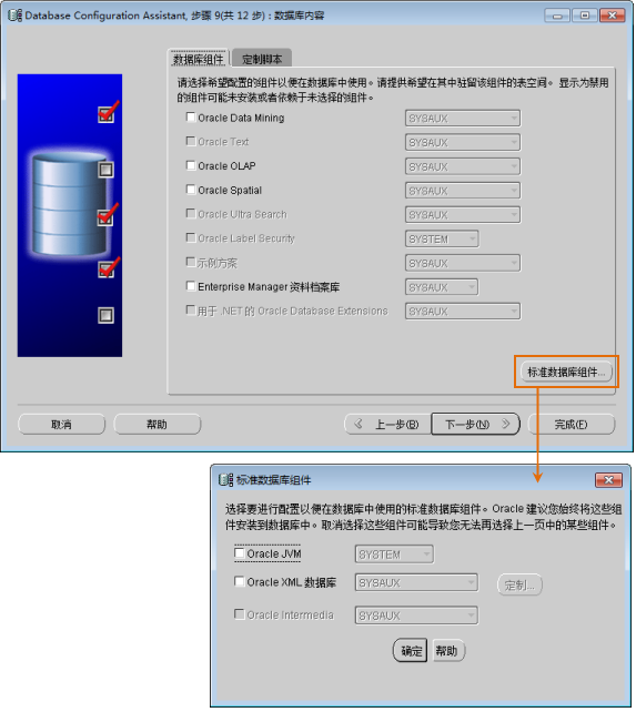 在这一步中,将“Oracle Data Mining”、“Oracle Spatial”和“Enterprise Manager 资料档案库”这三个复选框设置为非选中状态。然后单击“标准数据库组件...”按钮,弹出“标准数据库组件”对话框,将“Oracle JVM”、“Oracle XML 数据库”复选框设置为非选中状态,单击“确定”按钮。最后单击“下一步"”按钮,进入步骤10。