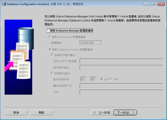 将“使用 Enterprise Manager 配置数据库”复选框设置为非选中状态,如下图所示。单击“下一步”按钮,进入步骤5。
