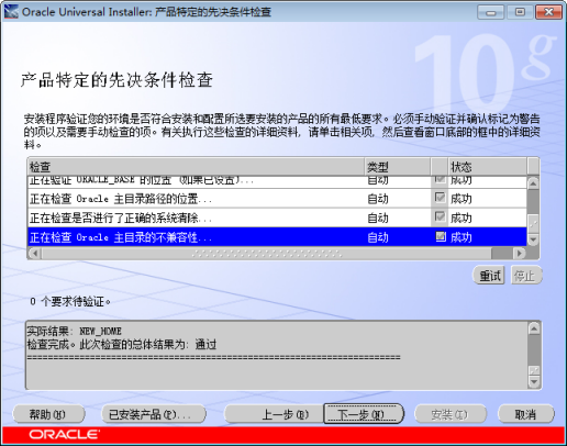 在安装数据库软件的过程中,Oracle 安装程序会自动检查您的系统环境是否符合所选安装产品的最低要求,即产品特定的先决条件检查,在检查验证成功后即可点击“下一步”按钮。