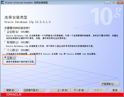 选择“定制”,如下图所示,根据自己的实际需求来安装 Oracle 的组件,并进行参数设置,这样可以节省磁盘空间并且提高 Oracle 的效率。然后,单击“下一步”按钮。