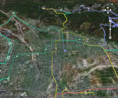 - 距离量算:是计算在表面模型中任意两点或多点之间的表面距离。当不加载地形通过距离量算的计算结果为球面上的弧线距离,距离单位是米;当加载地形时,通过距离量算的结果为依地形的折线长度,距离单位是米。