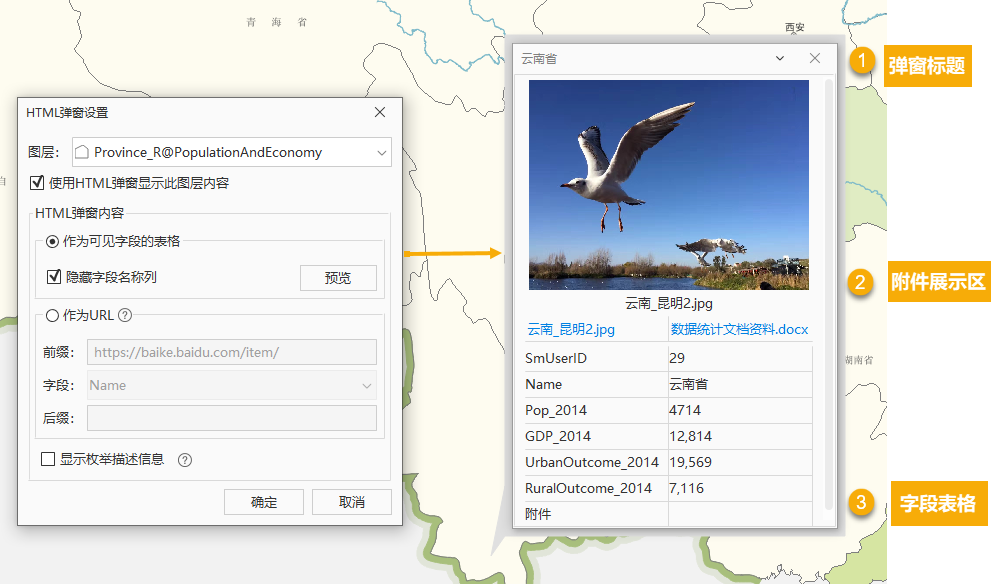 HTML弹窗查看(交互):在地图窗口点击对象,触发并浏览已配置好的弹窗内容。