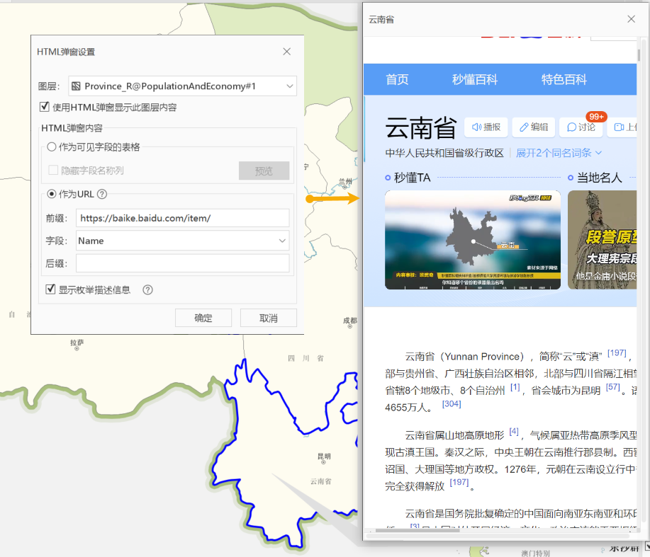 - 点击地图上“Name”为“云南”的对象时,弹窗将作为一个浏览器,直接加载并显示
