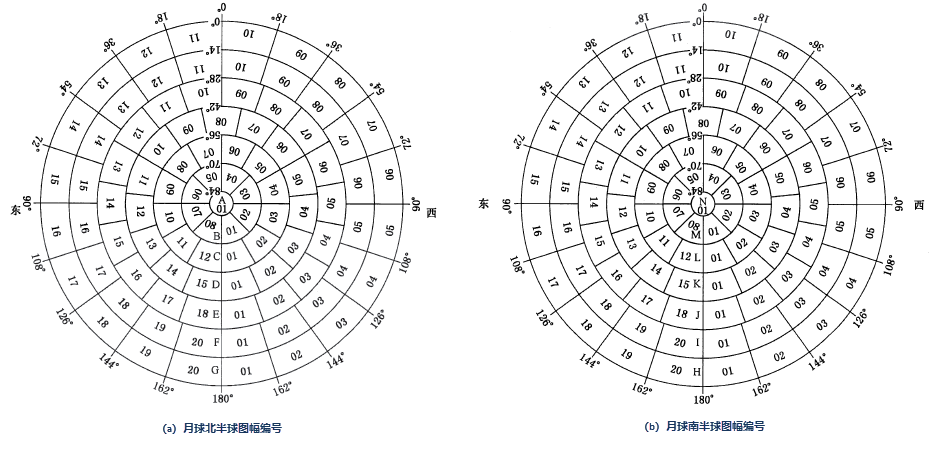 - 1:100万月球地形图图幅编号由 “图幅行号(字符码)+图幅列号(数字码)” 组成,具体如下图:
