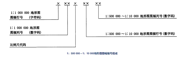 - 1:50万~1:1万地形图的行列号是将1:100万地形图按所含各比例尺地形图的经差、纬差划分成若干行和列。其图幅编号均由八位码组成,采用行列编号方法,由其所在1:100万地形图图幅编号、比例尺代码、各图幅的行列号组成(见下图)。