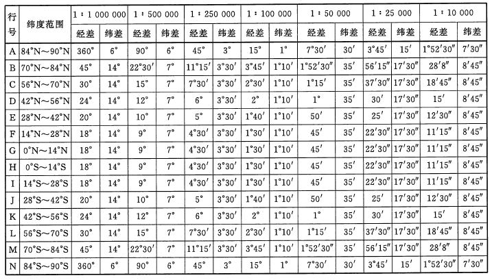 纬度范围 0°~14° 14°~28° 28°~42° 42°~56° 56°~70° 70°~84° 84°~90° 经差 18° 18° 20° 24° 30° 45° 360° - 基本比例尺月球地形图的图幅范围参考见下表: