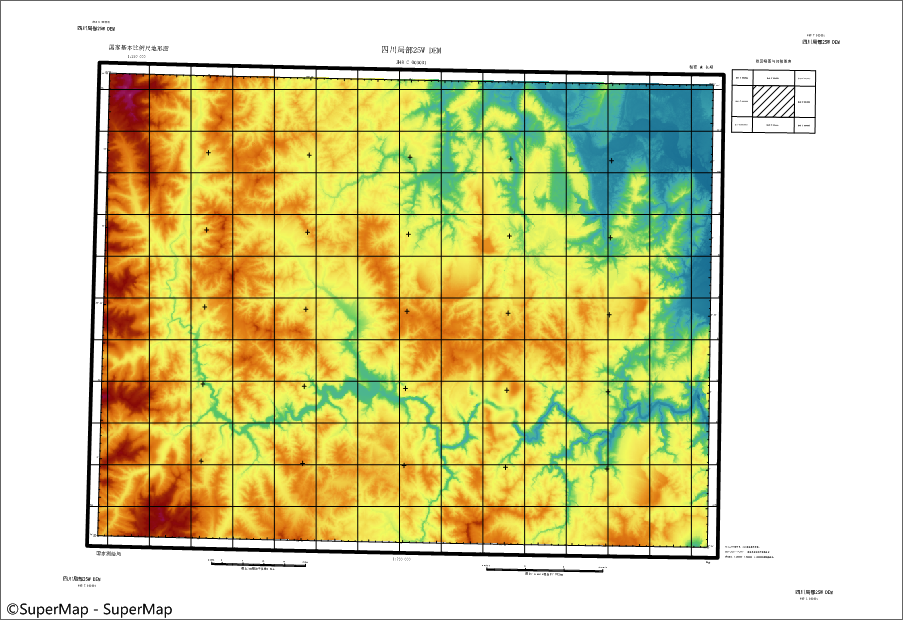 标准图幅图框功能用于为地图添加标准图幅的图框数据,结果以 CAD 数据集的形式保存到指定的数据源中。利用标准图幅图框功能,可以方便快捷地创建基于国家基本比例尺的各种图幅,提升地图制作的专业性。在标准图幅内添加具有相同坐标系的居民点、水系、土地利用、等高线、行政区划等国家基础地理信息数据,配以坡度尺、邻接图表、绘制信息等,从而快速创建一幅精美的全要素标准地图。