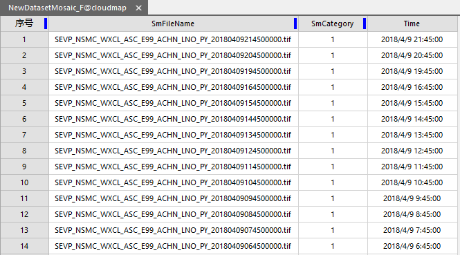 首先,创建一个镶嵌数据集,将目标多时相影像添加到该镶嵌数据集中。然后,在镶嵌数据集的轮廓数据集属性表中新建日期类型的字段存储时间值。根据影像反映的时间特征来决定新建时间字段的数目,例如影像为一个时间段的观测结果,就需要创建起始和结束两个时间字段。最后,编辑时间字段,填写影像对应的时间值。如下图所示,镶嵌数据集中添加了某天各观测时刻的卫星云图,在轮廓属性表中的Time字段记录了云图的观测时间。