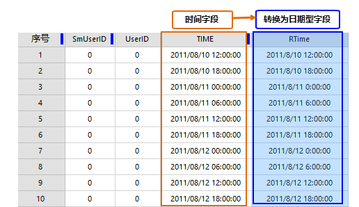 将非日期类型字段中的时间值转存到日期类型字段的操作如下,更多有关字段类型转换的功能,请参看“更新列”。