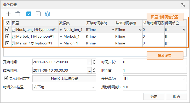 图:播放设置 - 管理图层列表:首先加载数据图层,单击“添加”按钮,在弹出的“选择”对话框中选择数据,添加至图层列表,支持添加多个数据图层。在图层列表区域对图层的时间属性进行设置.