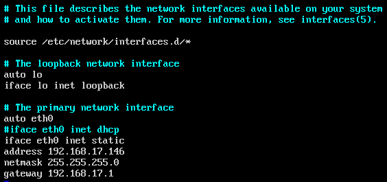 sudo vi /etc/network/interfaces可以参考如下图进行IP的设置: