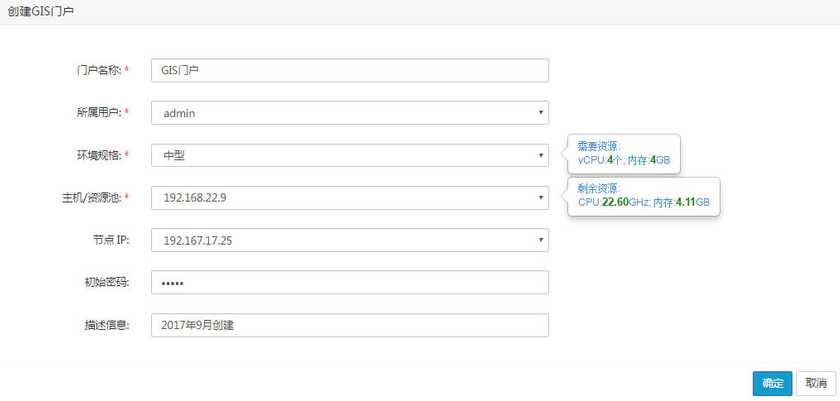 - 所属用户(必选):所创建的GIS门户分配给谁,即虚拟机所有者;超级管理员可以分配给所有用户,部门管理员可以分配给自己部门和子部门的所有用户。