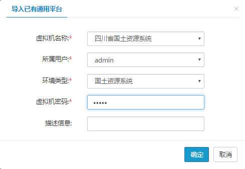 在通用平台管理页面,点击“导入已有通用平台”按钮,在弹出的“导入已有通用平台”对话框中,选择虚拟机名称,所属用户,环境类型和输入虚拟机密码,然后点击“确定”按钮,即可开始导入通用平台。